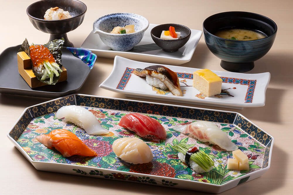 おすすめのランチコース「彩(いろどり)」4,400円は、11:00~16:00限定で提供するメニュー。にぎりを中心に2種の小鉢や手巻寿司、名物料理、お椀が楽しめます。にぎり6貫は、九谷焼のあでやかな器に盛りつけて提供。その日入荷の魚介を使うため、内容は日によって異なります。この日のネタは、あおりいか、本まぐろの赤身、真鯛、サーモン、帆立貝、梅肉を添えた芽ねぎ。酢飯は新鮮なネタの個性を引き立てる、すっきりとした味わい。米はすし酢との相性を考えて、石川県産の「ゆめみづほ」と「ちほみのり」をブレンドしています。