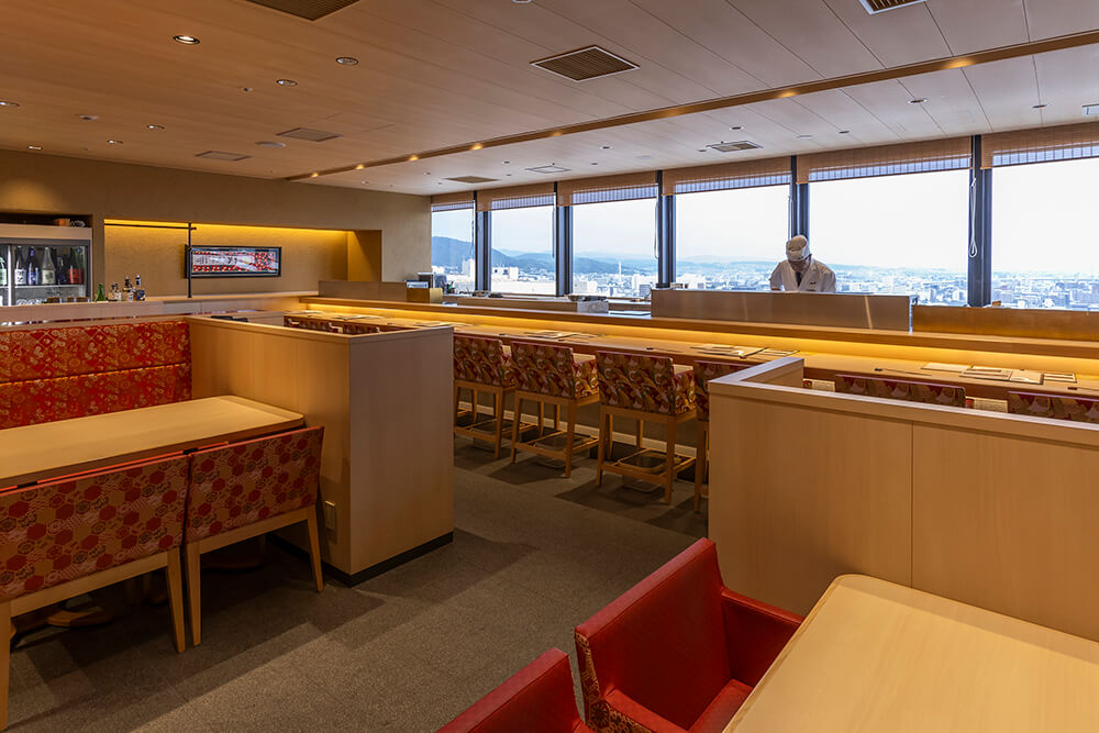 眺望のよい開放感のある寿司カウンターは11席。ゆったりとしたボックススタイルのテーブルは16席。椅子やソファの背面に加賀友禅があしらわれ、華やかな雰囲気