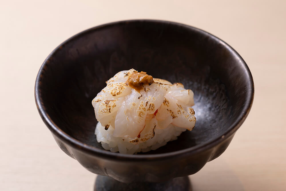 もう1貫のにぎりの一例、「赤海老の海老みそあぶり」は小さいどんぶりのような感覚で味わうひと品です。赤海老のぷりぷりとした肉厚の身を軽くあぶり、濃厚な海老味噌を添えて。香ばしい香りと風味が食欲をそそります。