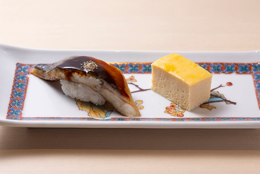 浜名湖産のうなぎを醤油とみりんベースの出汁でじっくり時間をかけて煮込んだ「名物 煮うなぎ」は、口のなかでとろけるほどやわらか。「珠姫の玉(ぎょく)」は、「鮨 珠姫 KYOTO」のオリジナルメニュー。蒸し焼きにしているため、まるでプリンのようになめらかな食感とやさしい甘みが楽しめます。