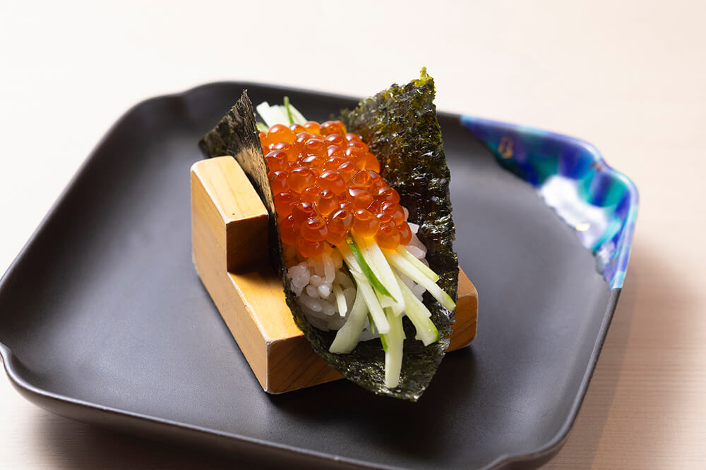 本日の手巻の一例は、イクラときゅうりの手巻寿司。「みずみずしいきゅうりの味わいをしっかり感じていただけるように」と、細切りにしたきゅうりがたっぷりと添えられています。パリッと香りのよい海苔、酢飯、イクラと爽やかなきゅうりの風味がバランスよく混ざり合い、あとくちはすっきりとしています。