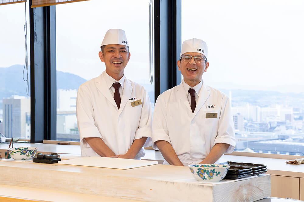 「金沢まいもん寿司」の新業態として、東京の玉川高島屋S.C.や大手町に店を構える「鮨 珠姫」。2024年6月、京都駅ビル(京都ポルタ“Porta Sky Dining”)11階にオープンした「鮨 珠姫 KYOTO」は関西初の店舗となります。南側の窓に面したカウンター越しに、晴れた日には生駒山やあべのハルカスまで一望できるという眺めのよさも自慢。「金沢に来た気分を味わっていただけるように」と店内には、加賀友禅や加賀ゆかりの作家の作品をあしらい、九谷焼の器を使うなど、古都・金沢の風情で迎えます。