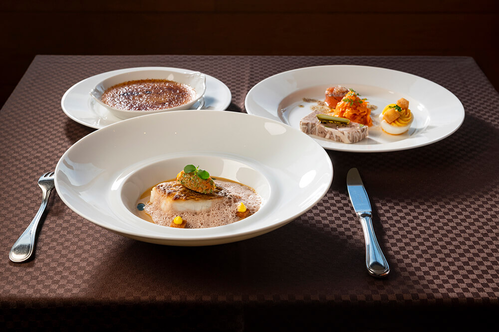 「ブラッスリーコース」4,950円の一例。前菜、メイン、デザート「クレーム・ブリュレ」。メインは魚料理または肉料理をチョイス。食後の飲み物付き