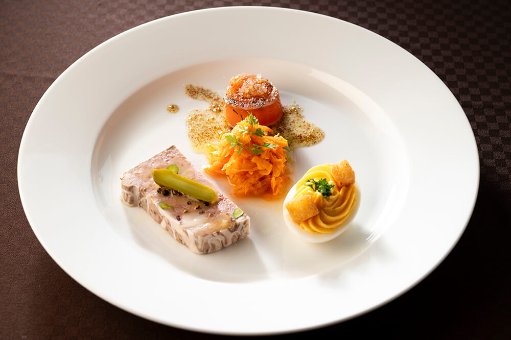 前菜の一例「ポール・ボキューズのスペシャリテ3種盛」。左から時計回りに、鴨のテリーヌ、サーモンマリネ、ウフマヨ。サーモンのマリネの上には、レモンの寒天が添えられている