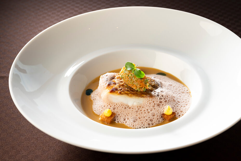 メインディッシュは、隔月替りの魚料理や肉料理など、4〜5種類からお好きな1品を選ぶことができます。「レストランひらまつ パリ」などで研鑚を積んだ料理長の鈴木啓太(すずき けいた)さんが素材を厳選し、モダンな表情に仕上げるメインディッシュは、付け合わせやソースに旬の食材を使った彩り豊かなプレゼンテーションも魅力的です。「骨付き仔羊とフォアグラのパイ包み焼き」(+5,500円)と「“ロッシーニ” 牛フィレ肉とフォアグラのソテー トリュフの香るペリゴールソース」(+5,500円)も、メインディッシュの選択肢として用意されています。
