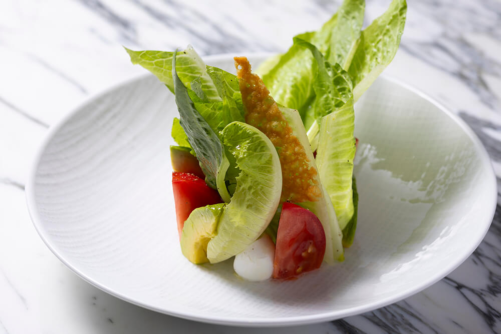 前菜「モッツアレラ フルーツトマト アボカドのサラダ仕立て」(写真は一例)。きわめてシンプルながら、野菜やモッツアレラチーズなどそれぞれの個性がしっかり引き立つ