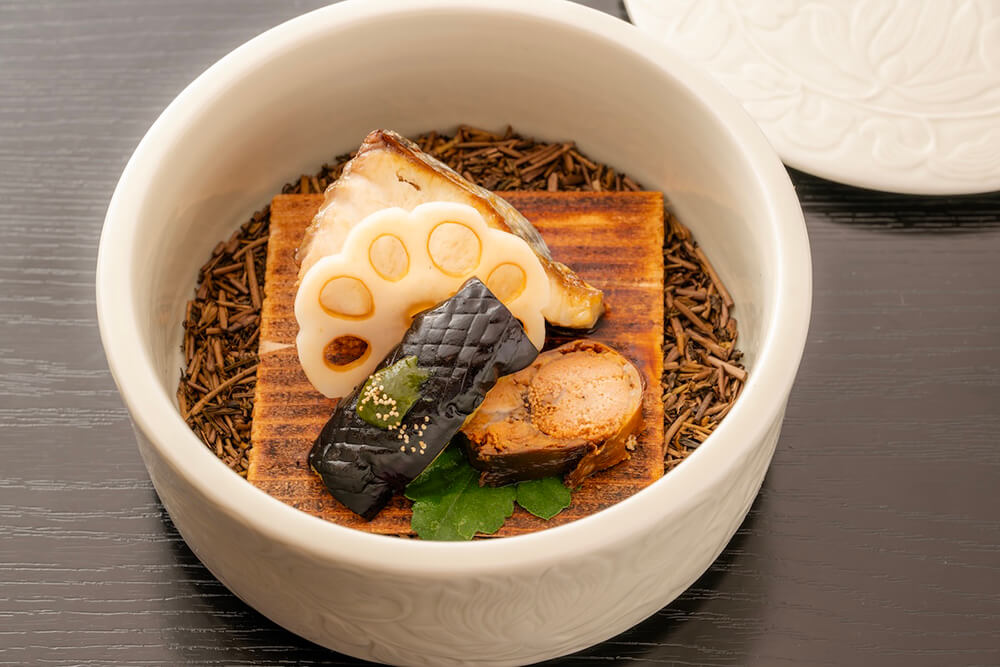 本プラン限定の「さわらの茶香焼き」は、器の底に煎りたてのほうじ茶が敷いてあり、ふたを開けると香ばしい香りが広がる演出も粋な焼物です。塩味をつけたほうじ茶に漬けることで味を染み込ませたさわらからも、ほんのりとお茶の香りが。玉味噌に抹茶を加えて練った抹茶味噌で味わうなすの田楽、番茶でやわらかく戻して甘露煮にした子持ち鮎など、お茶を生かした品々が盛り込まれます。