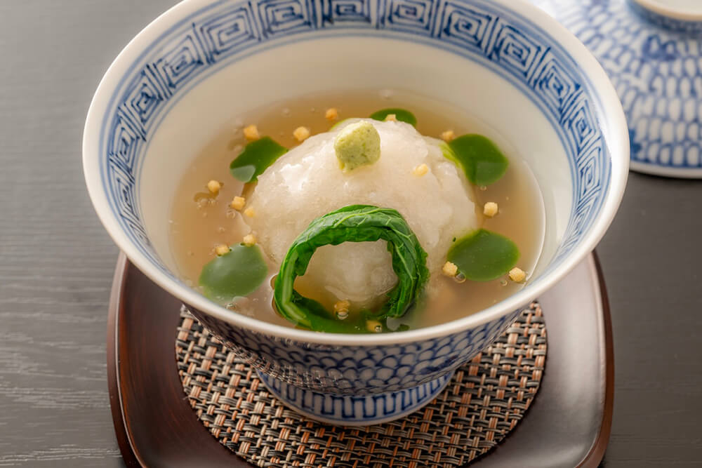 「地元・宇治の槇島(まきしま)地域で採れるこかぶは実が引き締まっていて、甘みが強い素材です」と左さん。かぶら蒸しを作る際にすりおろしたこかぶの水分を一番出汁と合わせて銀餡に仕立てることで、こかぶの甘みやうま味をまるごと生かしているそうです。本プランのかぶら蒸しには、お正月にちなんでおめでたい鯛をご用意。さらに抹茶餡をあしらうことで、彩りも美しく、宇治ならではのひと品に仕上げています。