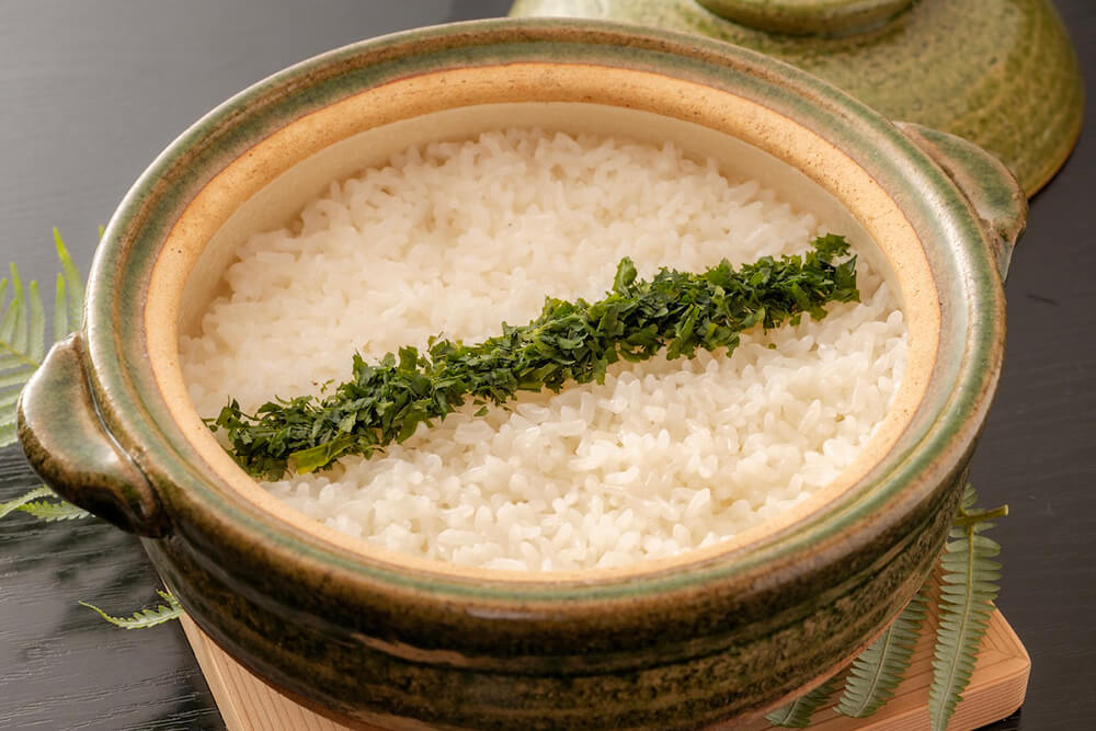 献立の締めには、特別にご用意する「碾茶(てんちゃ)ごはん」が登場します。お米は秋田の米農家から仕入れるあきたこまち。少し塩味をつけた昆布出汁で米を炊き、炊きあがって蒸らしが終わったら、碾茶を加えます。石臼で挽く前の抹茶の原料である碾茶は、まろやかな甘みと香りが特徴。土鍋のふたを取ると、炊きたてのごはんとお茶の芳しい香りが食欲をそそります。