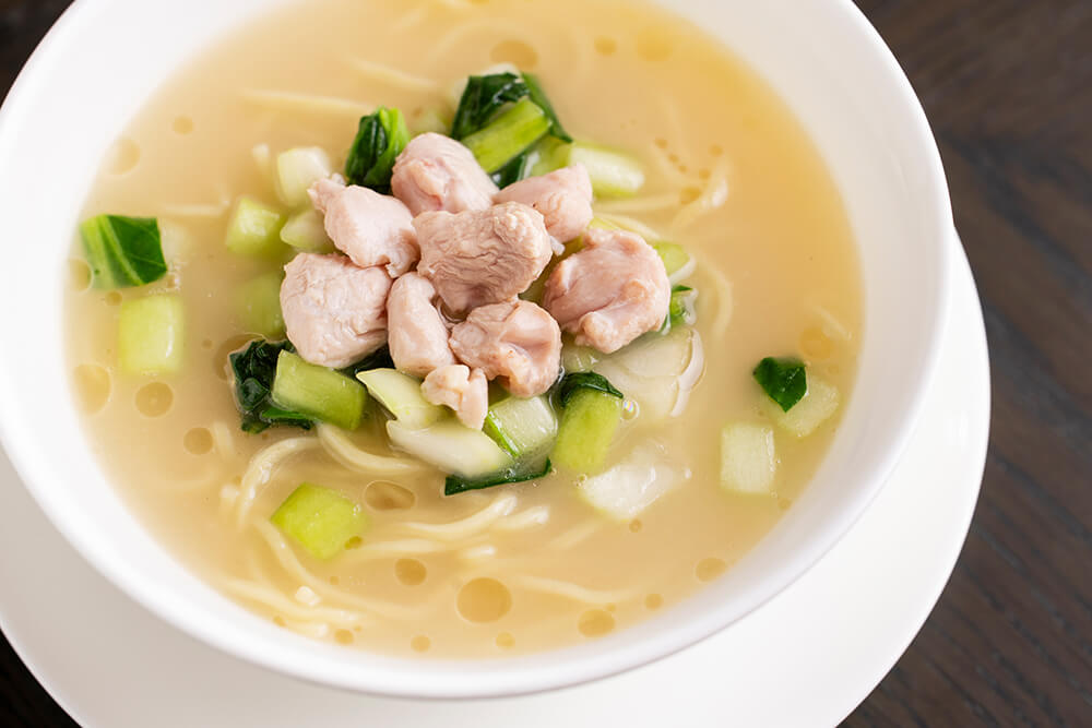 リッチなコースの締めは、ラオバンヌードル(鶏煮込みそば)。鶏のもみじやガラ、丸鶏、皮付きのすね肉を、ねぎやしょうがなどの香味野菜とともに、じっくり6時間ほど炊いて取ったスープは、ほっとするやさしい味わいながら深いコクが堪能でき、身も心も温まります。