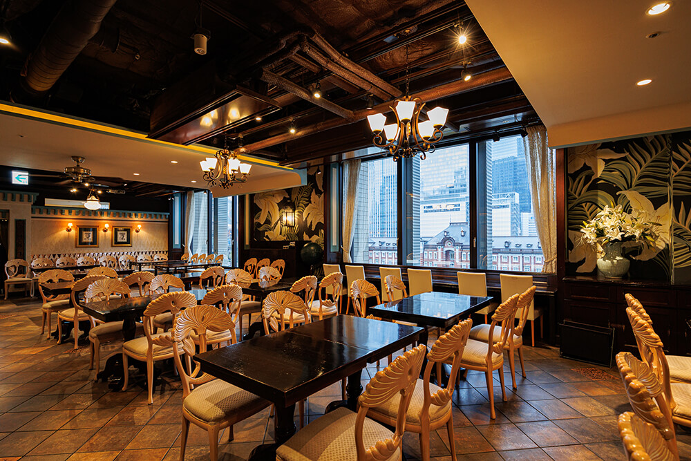 広々とした店内のコンセプトは、東洋のリゾートをイメージしたノスタルジックオリエンタル。大輪のカサブランカ(百合)で飾られたメインフロアからは、赤レンガ造りの東京駅を真正面に見下ろすことができます。