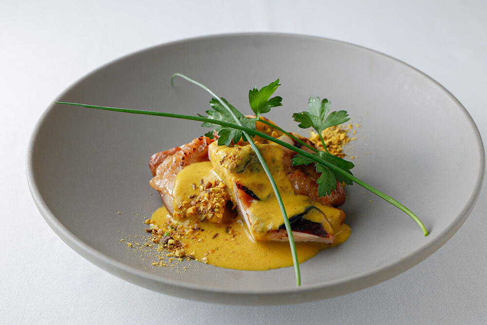 生春巻きの次に登場する魚料理と肉料理は、ベトナムをはじめとする東南アジアの食材とフレンチのソースを融合させたスタイル。たとえば初冬のコースでは、魚料理は「カサゴとエノキのフリット バイマックル風味のきのこソース」、肉料理は「大山鶏とタイラギ貝のヌオン 南瓜のココナッツソース」が登場しました。エキゾチックな香りのソースと旬の食材のハーモニーは、ベトナムフレンチならではの魅力です。