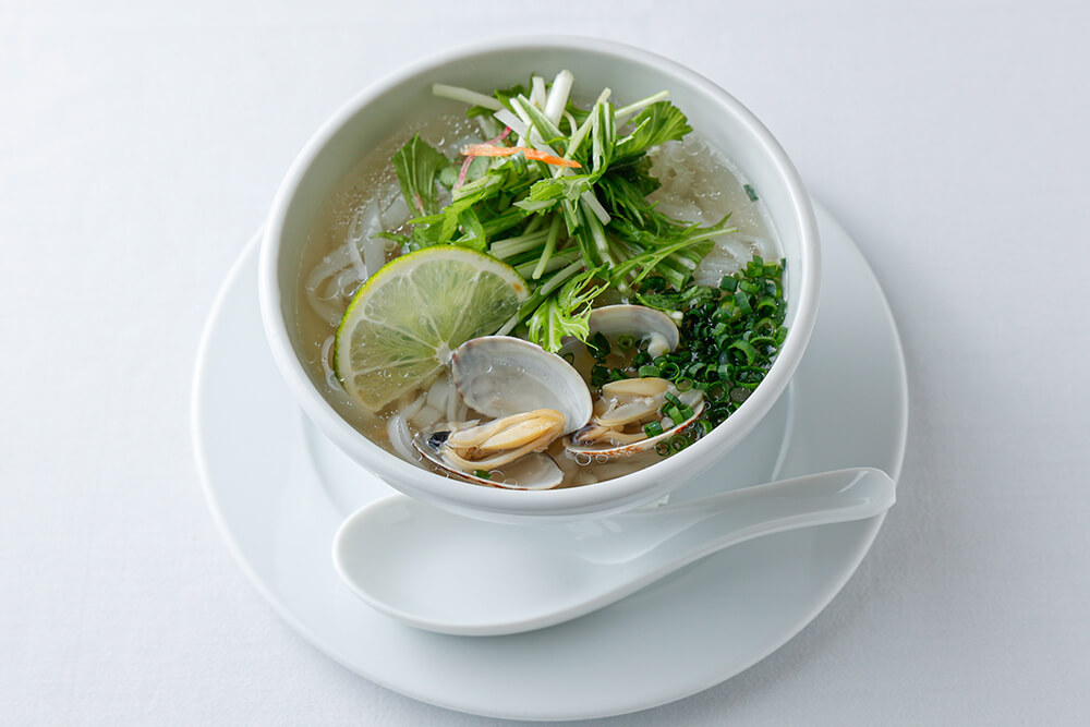 「あさりのフォー」のトッピングは、ドレッシングで和えた水菜、にんじん、紅芯大根と、殻付きのあさり、ライムスライス。ライムジュースで割ったねぎ油をかけてさっぱりと仕上げられている