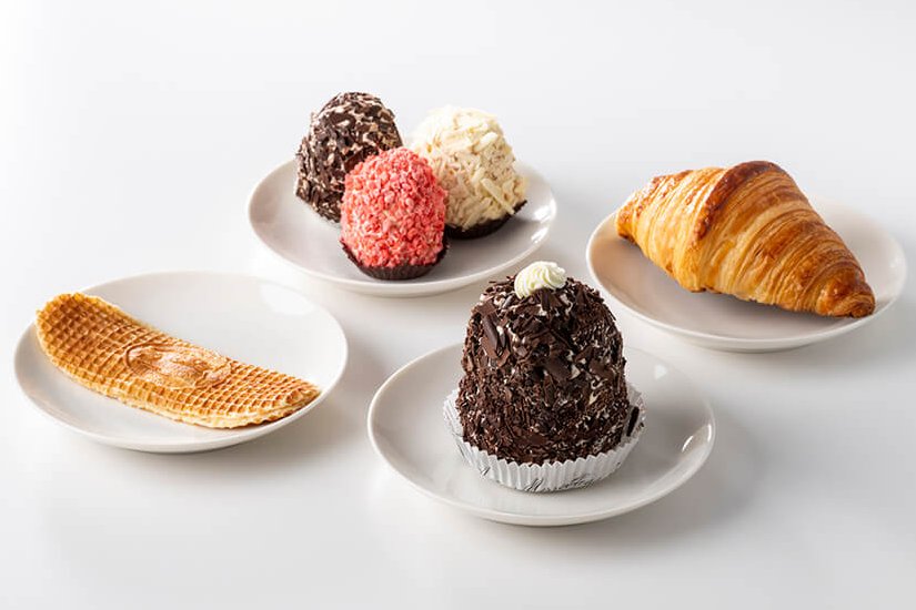 メレンゲにホイップクリームを重ねた「メルベイユ」は、チョコレートやプラリネ、キャラメルなど、口溶けとともに異なる風味を楽しめる7種を展開。薄くやわらかな生地に香り豊かなクリームを挟んだ「フラマンドル風ワッフル」は、バニラ、ヴェルジョワーズ(ラム酒の香りを加えたクリーム)、コーヒー、スペキュロス、抹茶の5種。クロワッサンは、伝統製法によって芳醇なバターの香りを引き出しています。