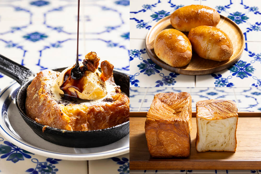 左/鉄板フレンチトースト1,500円(14:00から提供、店内のみ)。右上/メープル塩パン330円。右下/堺筋倶楽部限定のデニッシュ食パン1,000円(ハーフ500円)