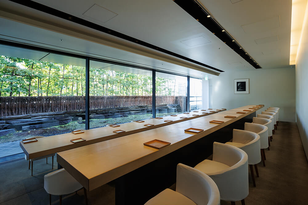 白木のカウンターは9m20cm。苔庭に面した窓に沿って2列配されている