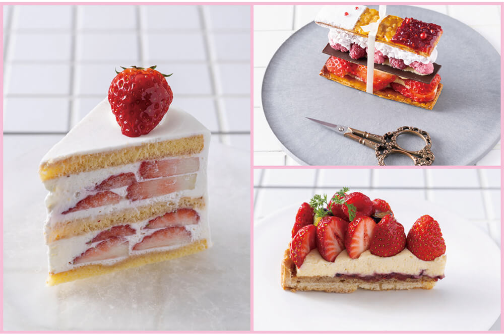 左/「苺のプレミアムショートケーキ」1,458円~。右上/「苺のミルフィーユ」1,058円~。結ばれたリボンをカットするのも楽しい。右下/「苺のタルト」1,458円~